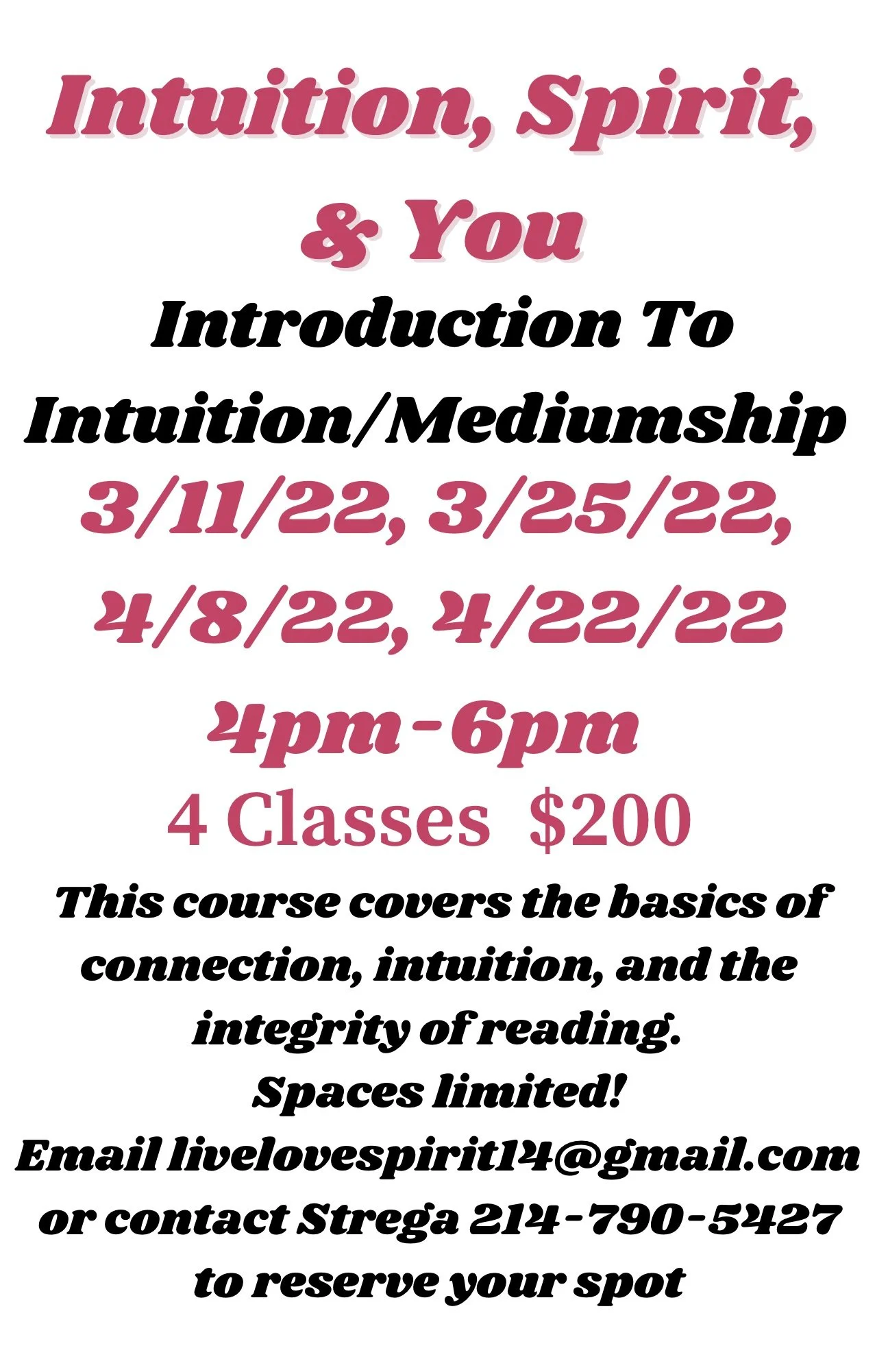 This is a 4 part class that will go over the beginning aspects of connecting to our intuition and how to acknowledge and trust the messages we receive from Spirit. Each class will add a new understanding of Spirit and how it connects to us. $200 for all 4 classes.