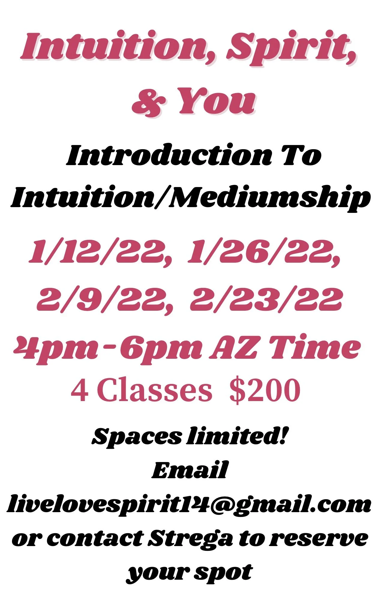This is a 4 part class that will go over the beginning aspects of connecting to our intuition and how to acknowledge and trust the messages we receive from Spirit. Each class will add a new understanding of Spirit and how it connects to us. $200 for all 4 classes.